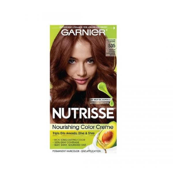Garnier Nutrisse Medium Golden Mahogany Brown 535 (Chocolate Caramel) is a medium brown shade with both golden tones and red reflects to create a rich, warm result. Shade 535 (Chocolate Caramel) provides 100% gray coverage and is best for anyone with natural hair between light brown and black.